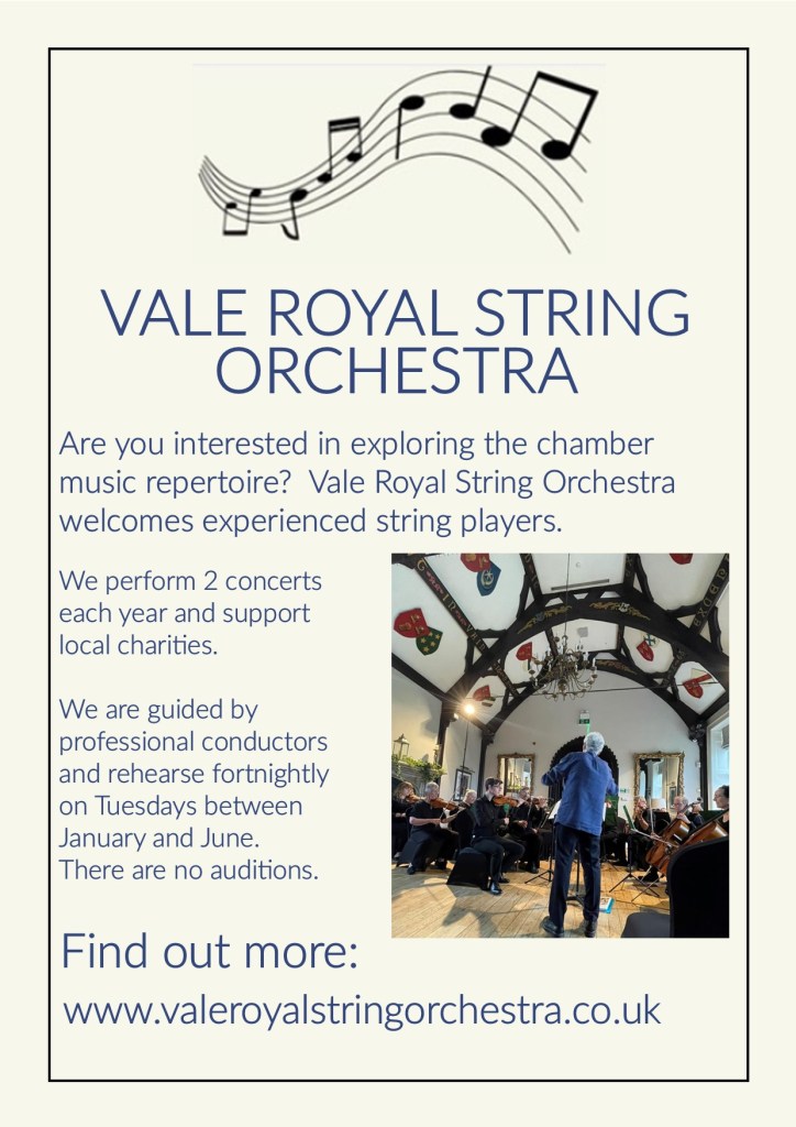 These web pages introduce the Vale Royal String Orchestra whose membership comprises experienced string players based in Mid Cheshire. We play for the love of music and to support local charities.